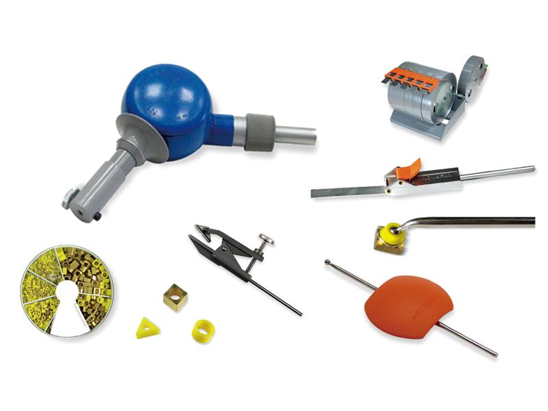 1. 往復式打光工具:球狀手腕型,可使用剉刀,研磨工具做前後往復式動作,加工操作最大可做270度角調整, 2. 球型連接棒:連接圓形、方形銅環或塑膠環。 3. 其他配件:打磨零件盒、油石夾、T型棒、砂紙夾、鑽石銼刀。 | |||||